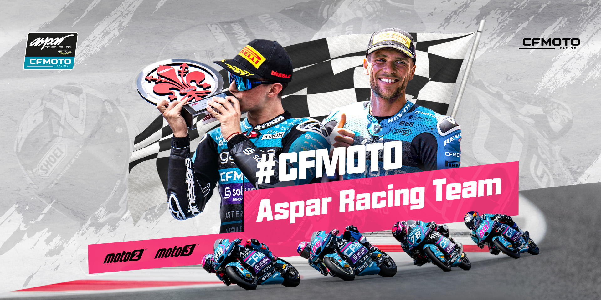 It has been a long road to win the Moto3 title and he has shared it with many people. Many of them have even been on the podium with him: Jorge, Nico, Mauri, Barabba, Óscar, Roger, Majo, Giagi, Paolo and Vicente. Without them, and many others, you would not be reading this text and he would not have celebrated the seventh world title in the light category in Japan for a master 125 / Moto3 team, the CFMOTO Aspar Team.