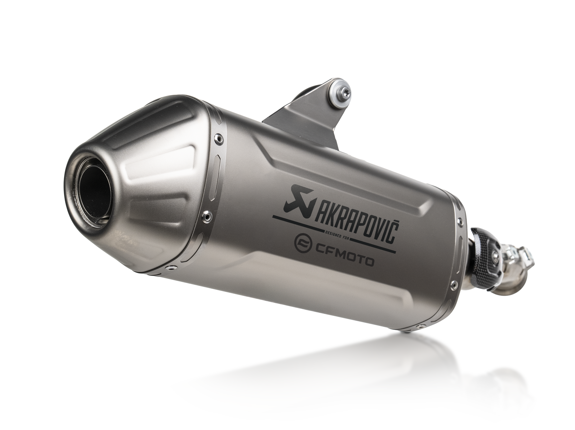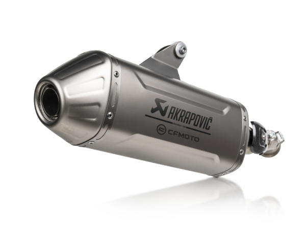 - Race-look en Hoogwaardige Constructie: Deze uitlaat is gemaakt van titanium. Hij heeft een gelaste titanium beugel en eindkap. Bovendien is de uitlaat afgewerkt met lasergeëtste "designed for CFMOTO" logo's. De look is geïnspireerd op de Dakar Rally.