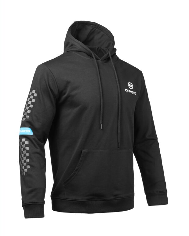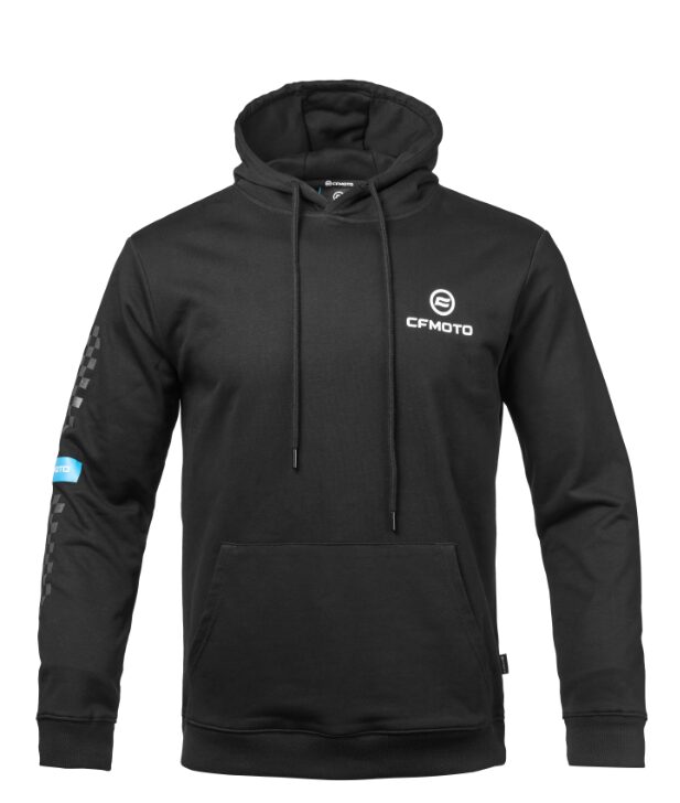 - Stijlvol Ontwerp: De borst is voorzien van een subtiele CFMOTO-print. De rechter mouw heeft een opvallend schaakbordpatroon en een blauwe band met het merklogo. Dit geeft de hoodie een unieke, sportieve uitstraling.